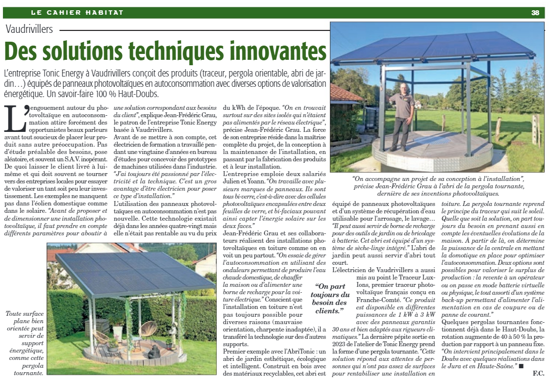 Une première pergola photovoltaïque orientable au village15/05/2025 02/10/2025 Article de presse dans "C'est à dire" (le cahier de l'habitat) Partager Publications en relation15/05/2025Une première pergola photovoltaïque orientable au villageEn savoir plus24/03/2025Une énergie gratuite, locale et durable ? Oui, c’est possible.En savoir plus19/04/2022Lux-ions suit le soleil à la traceEn savoir plus